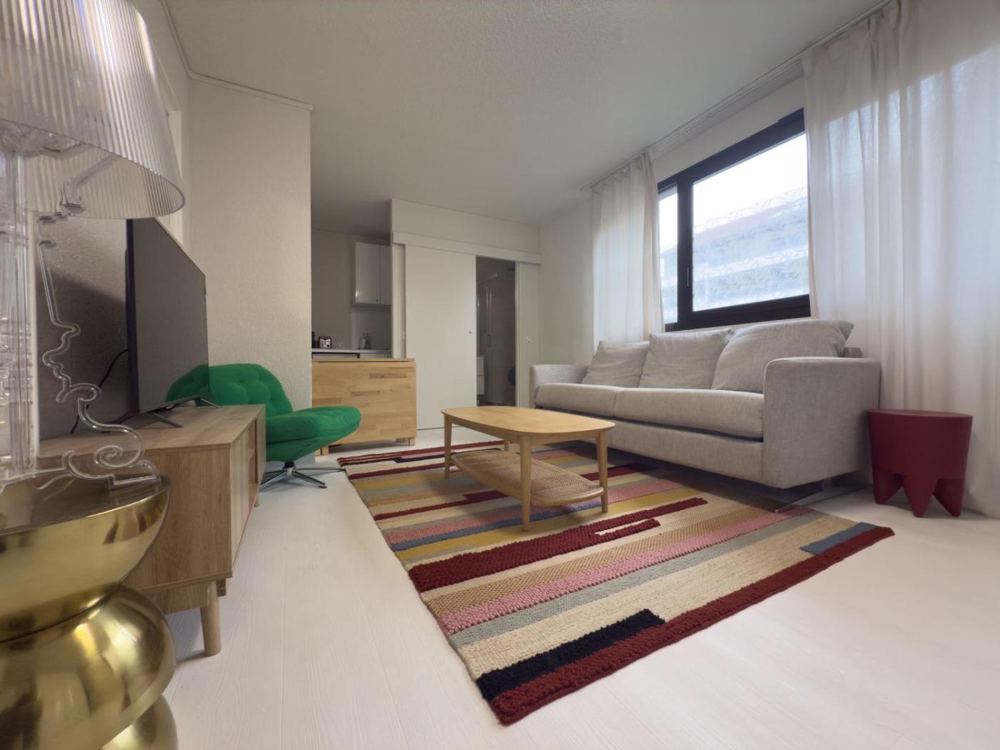 Cet appartement compte 1 chambre, un salon comportant une télévision à écran plat, et une cuisine entièrement équipée.